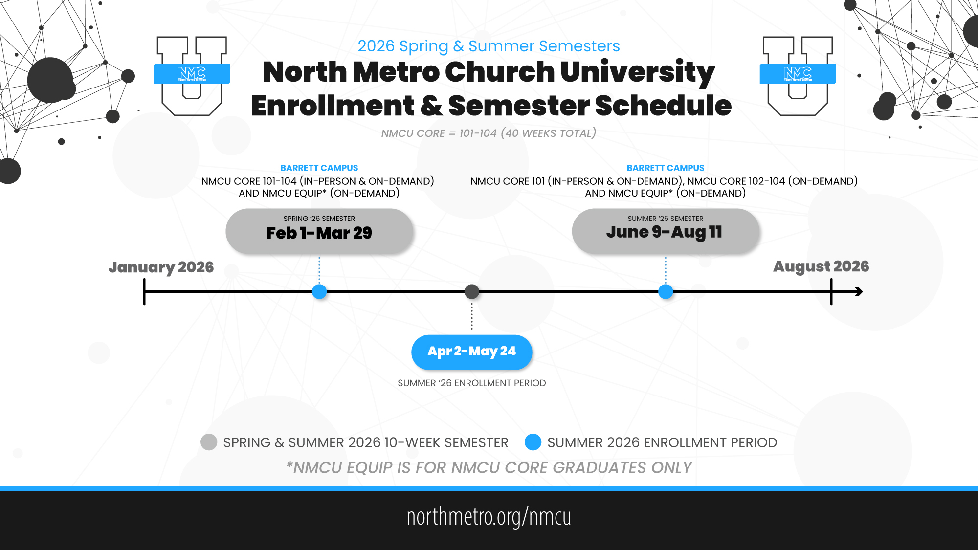 North Metro Church University is made up of three elements: our Core courses, Equip modules, and seasonal Workshops.
